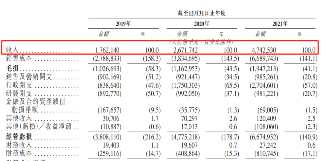营收方面,威马汽车的总收入由2019年的17.62亿元迅速增长51.6%至2020年的26.72亿元,并由2020年进一步增长77.5%至2021年的47.42亿元。