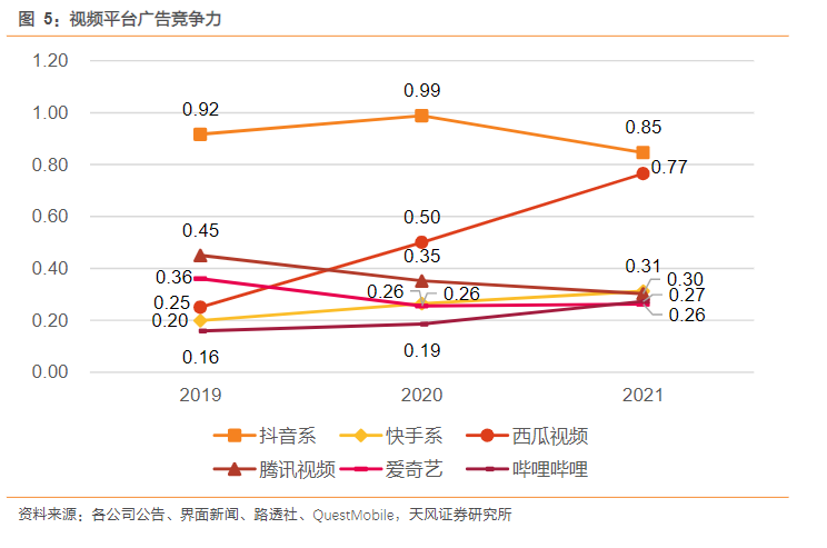 广告行业本身就是个零和游戏,互联网技术的发展对曝光精准度提出了更高的要求,依赖算法推荐的短视频具有天然优势。天风证券发布的《中国互联网广告季度追踪》给出了竞争力排名,抖音系一骑绝尘,长视频网站都有衰退的趋势。