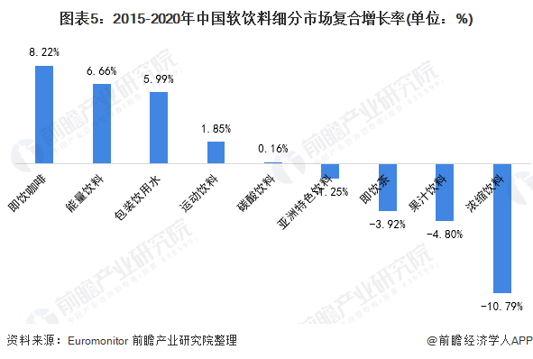 图:中国软饮各细分市场年复合增长情况,来源:前瞻产业研究院