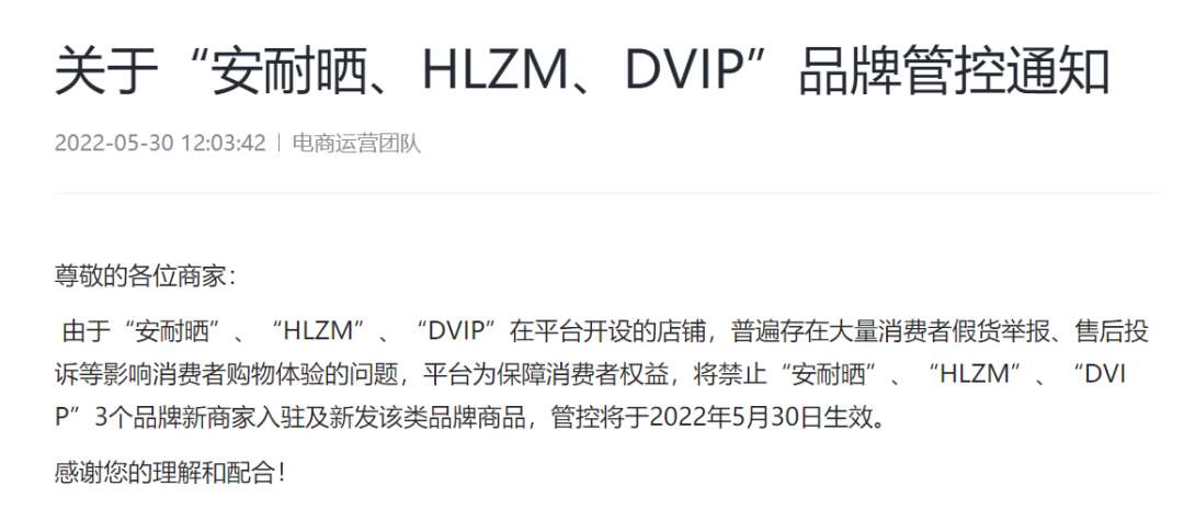 公告显示,由于“安耐晒”“HLZM”“DVIP”在抖音平台开设的店铺,普遍存在大量消费者假货举报、售后投诉等影响消费者购物体验的问题,平台为保障消费者权益,自5月30日,将禁止这3个品牌的新商家入驻及新发这3个品牌旗下的商品。