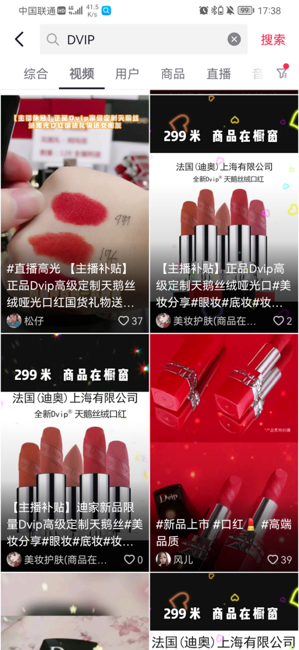 青眼以上述关键词在抖音上搜索时,不少种草视频和店铺中宣称,“法国(迪奥)上海有限公司全新Dvip天鹅丝绒口红”“HLZM则宣称为海蓝之谜(英国)有限公司”,且价格不菲,如Dvip天鹅丝绒口红售价299元。并且,从外观上看,“DVIP”的口红与LVMH集团旗下迪奥口红非常相似,“HLZM”旗下产品则撞脸雅诗兰黛集团旗下的贵妇品牌“海蓝之谜”。