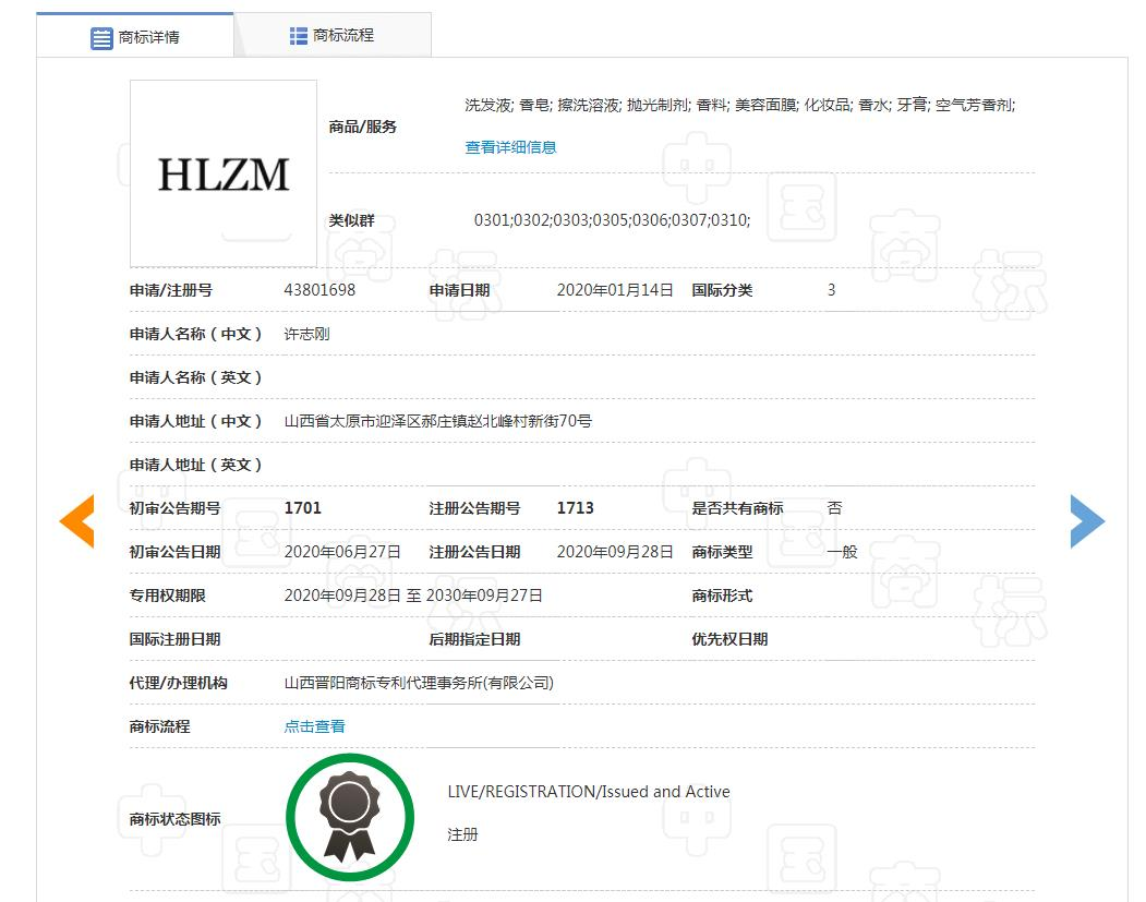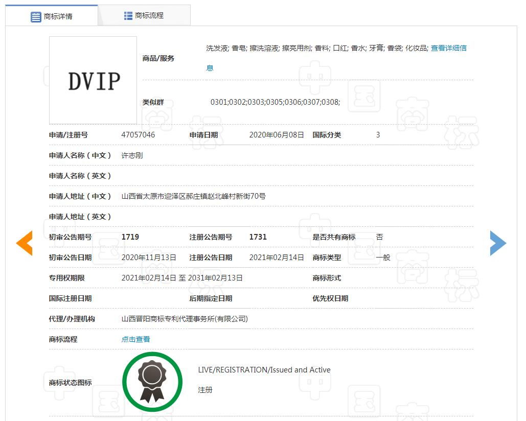 更为巧合的是,中国商标网信息还显示,“DVIP”和“HLZM”第3类商标所属权均为自然人“许志刚”所有。“DVIP”于2020年6月申请注册,2021年2月通过注册;“HLZM”则是于2020年1月申请,同年9月注册成功。