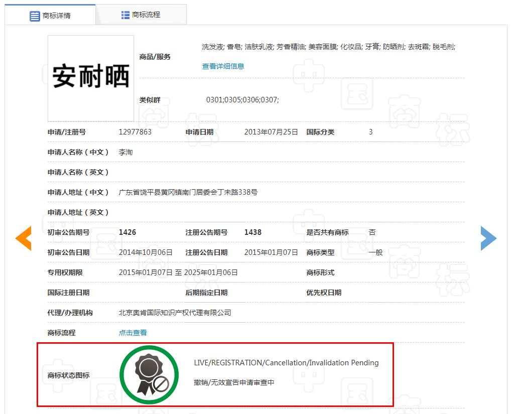 根据中国商标局信息显示,自然人李洵于2013年7月首次对安耐晒第3类商标进行了申请,并于2015年1月获得了注册。目前该商标的状态显示为“撤销/无效宣告申请审查中”。这意味着,有第三方对该商标提出了撤销/无效宣告的申请,但根据《商标法》相关规定,该商标目前仍然有效。