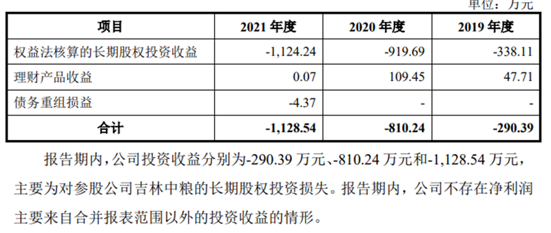 但这次押注的成果并不理想,根据招股书显示,报告期内,恒鑫生活投资收益分别为-290.39 万元、-810.24 万元和-1,128.54 万元,主要为对参股公司吉林中粮的长期股权投资损失。