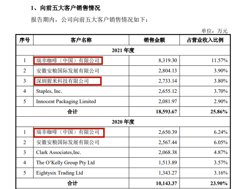 这得益于恒鑫生活的国内客户,一众新茶饮品牌的崛起。除前文提到的瑞幸咖啡之外,2021年喜茶旗下全资子公司深圳猩米科技有限公司成为新增第三大客户,销售收入占比为3.8%。