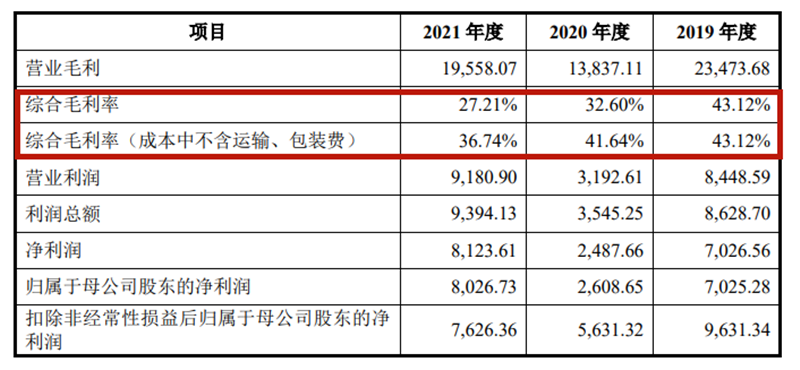 在净利润因股份支付下降的同时,恒鑫生活的毛利率也一同下降。根据招股书显示,2019-2021年,恒鑫生活综合毛利率分别为43.12%、32.6%和27.21%。