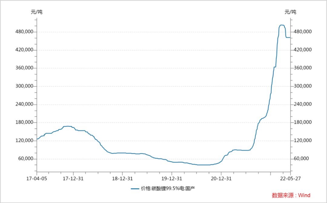 2021年,碳酸锂涨价幅度高达430%以上。进入2022年,局面进一步失控,碳酸锂价格从年初的28万/吨最高涨至超50万/元吨,在短短三个月的时间里又翻了近乎一倍。
