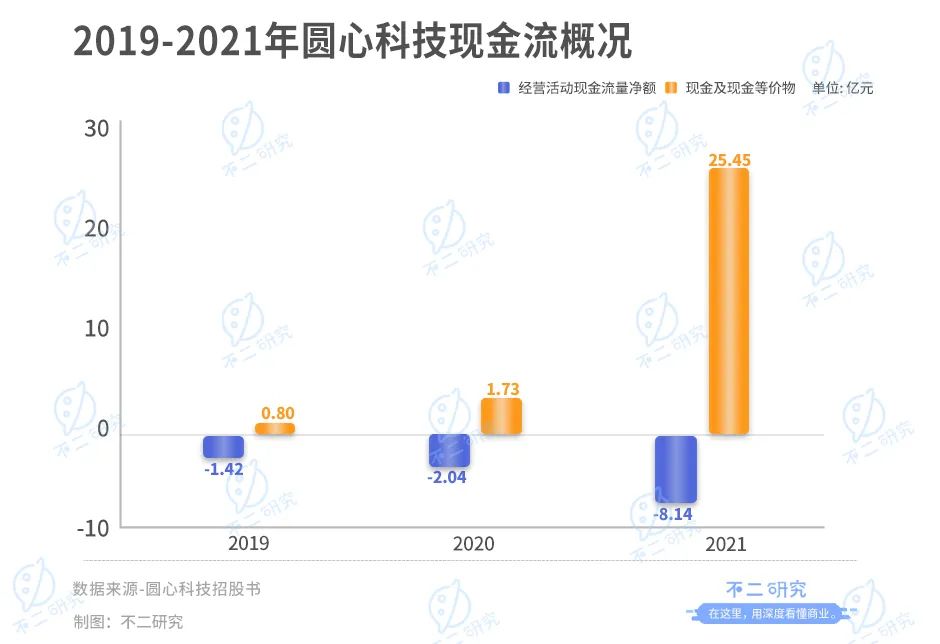 此外,2019-2021年,圆心科技录得经营现金流出净额1.42亿元、2.04亿元、8.14亿元;其在风险因素中坦承,主要由于不断加大院外综合患者服务的市场推广力度,导致销售及市场推广开支相应增加。