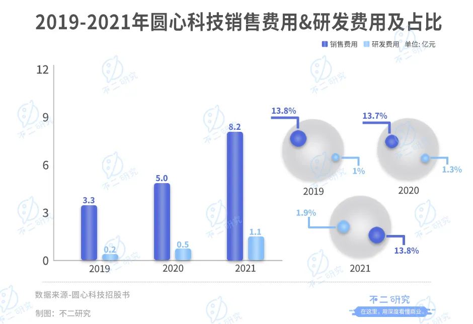 与之形成鲜明对比的是,2019-2021年,其研发开支为2265.1万元、4629.4万元、1.13亿元,研发费率仅为1%、1.3%、1.9%。