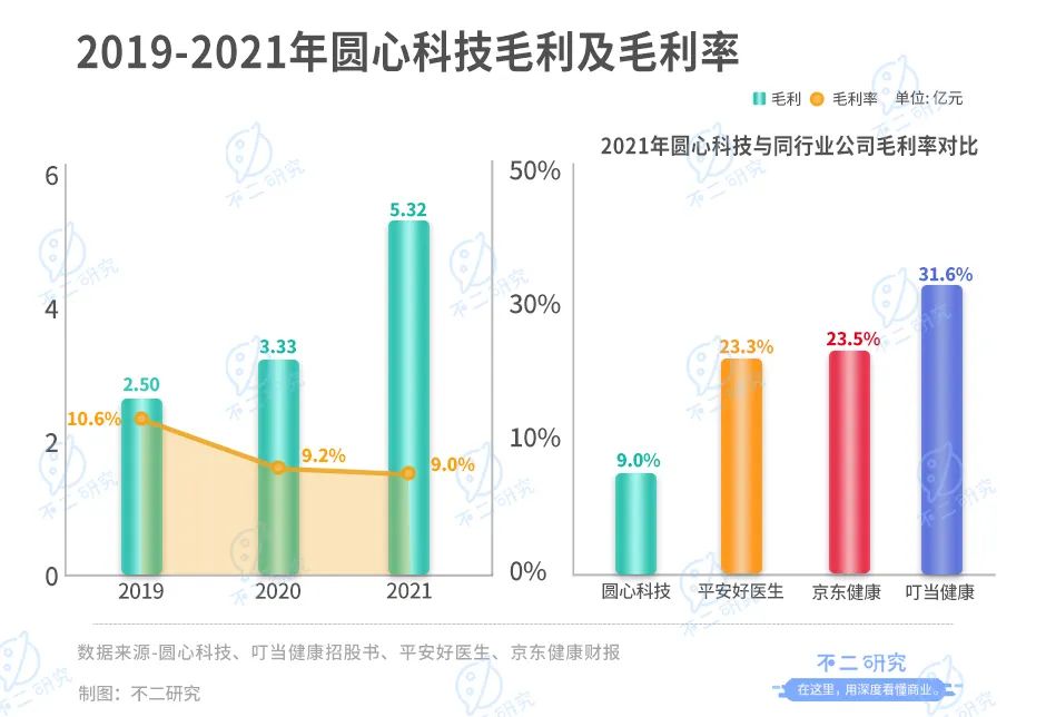 目前,圆心科技的主要营收来源为药品销售。「不二研究」认为,这看似找到可以突围的盈利模式,但由于药品是标类商品,附加服务值不高,叠加供应端影响,实则毛利率较低。