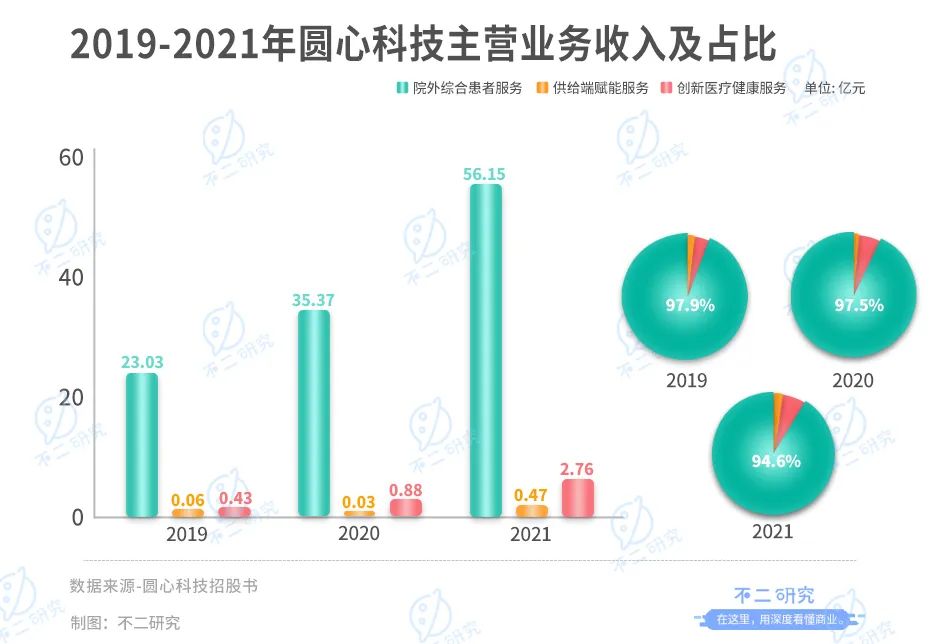 如果拆解收入构成,2019-2021年,来自院外综合患者服务的营收为23.03亿元、35.37亿元、56.15亿元,同期营收占比高达97.9%、97.5%、94.6%,在收入中占绝对主力。