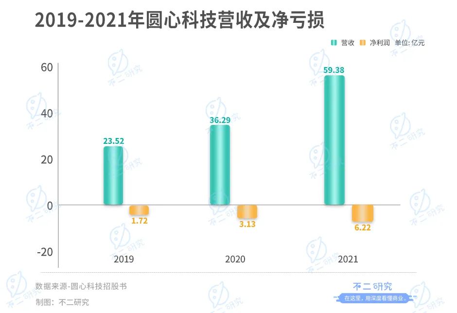 圆心科技招股书显示:2019-2021年的营收23.52亿、36.29亿、59.38亿;尽管其营收规模逐年上升,但亏损额度也在持续扩大,难逃“增收不增利”。