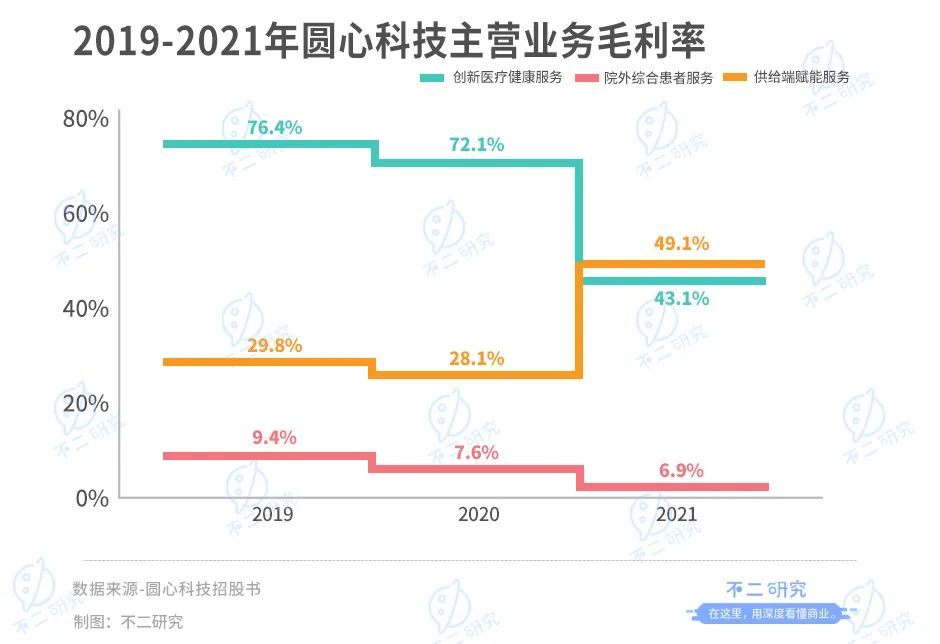 在「不二研究」看来,圆心科技依赖院外综合患者服务“一条腿走路”,固然在创业初期享受到快速占领市场等红利,但这也是拖累其整体毛利率的主要原因之一。