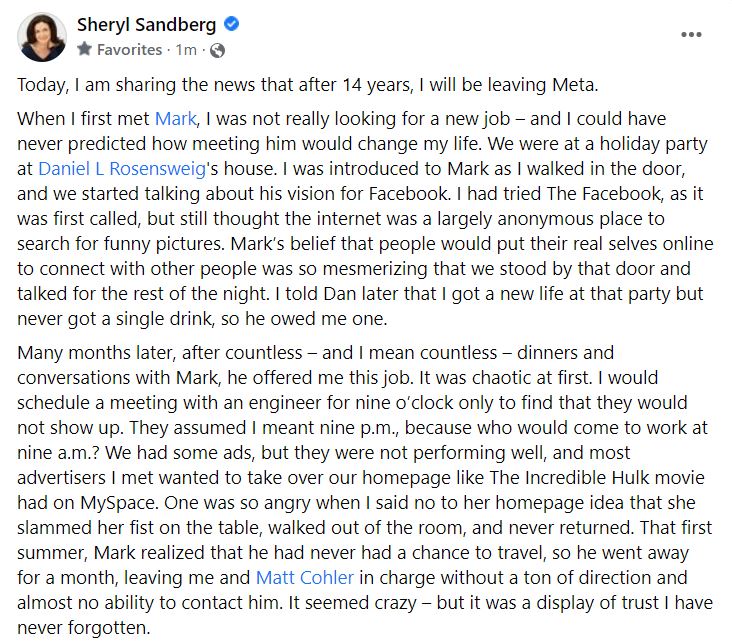 在Facebook上发表的告别信中,桑德伯格回顾了刚刚加入Facebook时经历的混乱、公司的成长、取得的成绩,还谈到了女性在科技领域的艰辛和挑战,表达了对扎克伯格和共事多年的同事的深厚感情。