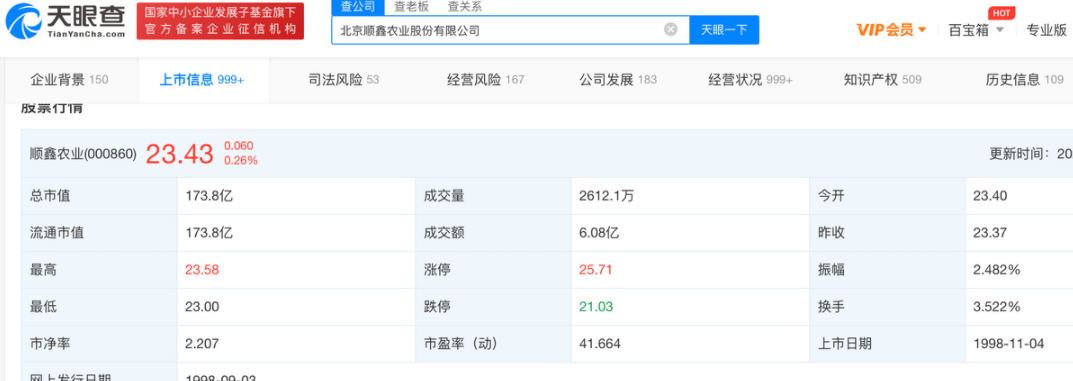 天眼查APP显示,从牛栏山母公司顺鑫农业发布的财报数据来看,根据其发布的2021年半年报,公司白酒业务实现营收65.36亿,同比增加1.09%,营收占比从去年同期的67.92%提升至71.11%。根据天眼查APP显示,顺鑫农业于1998年上市目前市值173.8亿。