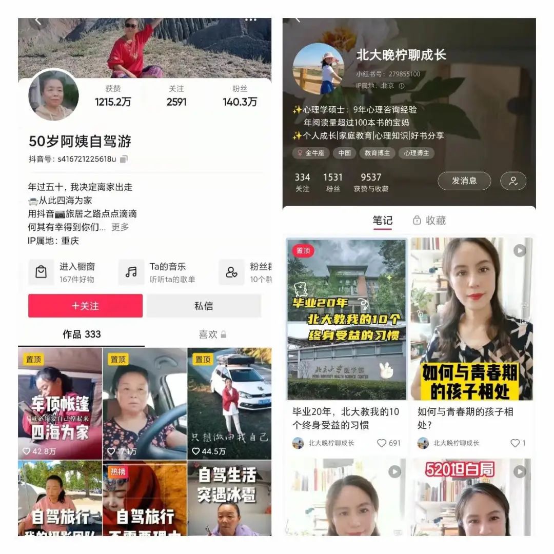 图/“50岁阿姨自驾游”抖音账号;晚柠小红书首页(左、右),来源/燃财经截图