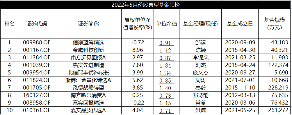 10只位列黑榜的基金中,仅有信澳蓝筹精选、嘉实回报精选两只基金收益为负,这和消费板块仍未有起色有关。Wind数据显示,5月份中证全指主要消费指数(000990.CSI)收益率为1.66%,今年至今的回报率为-15.76%。