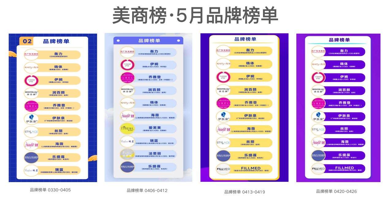 此外,上海其胜生物旗下的爱芙莱,Q-Med AB旗下的瑞蓝,科妍生物旗下的法思丽,四环医药代理的乐提葆亦有不俗表现,常跻身美商榜前十之列。