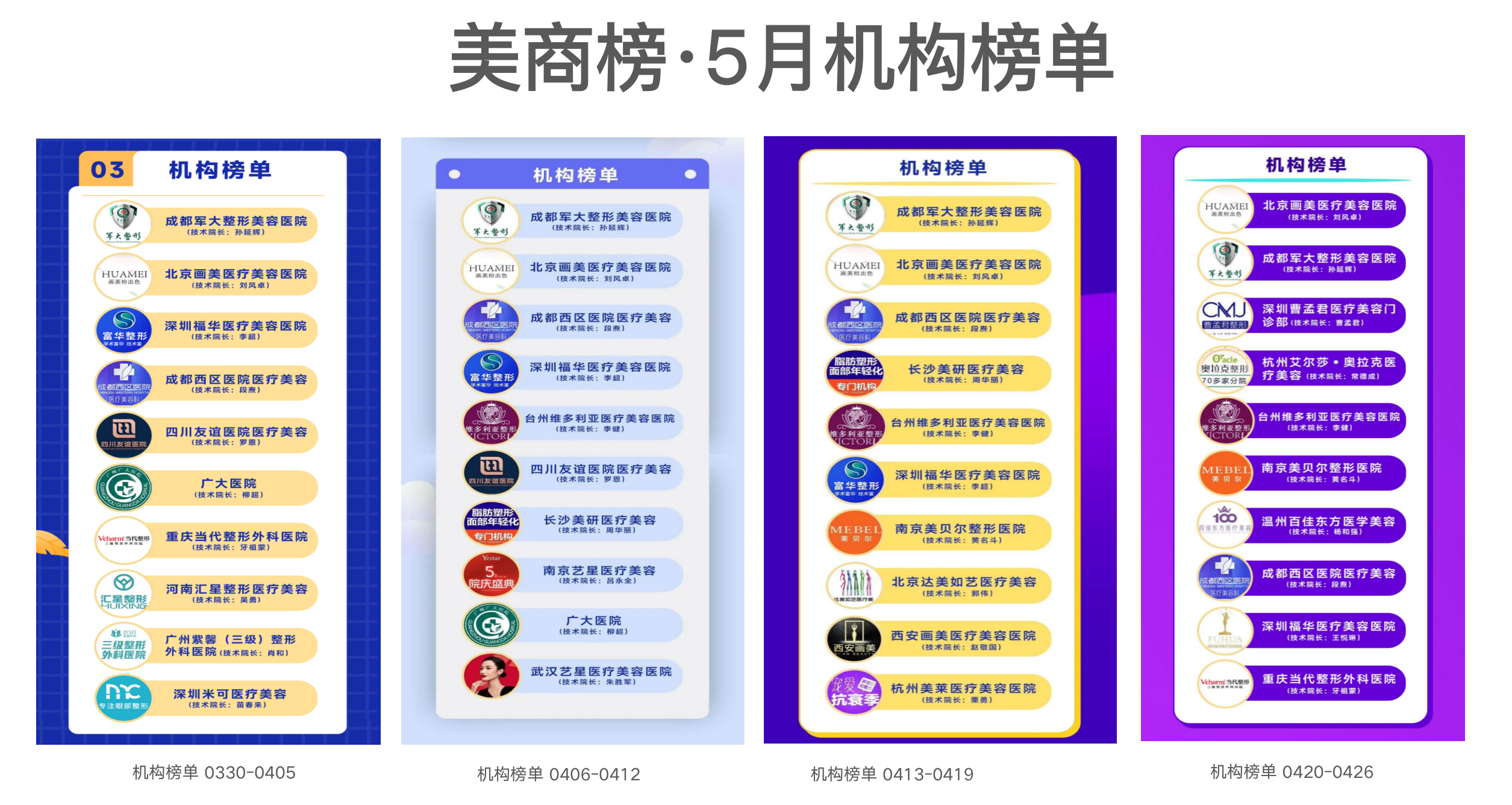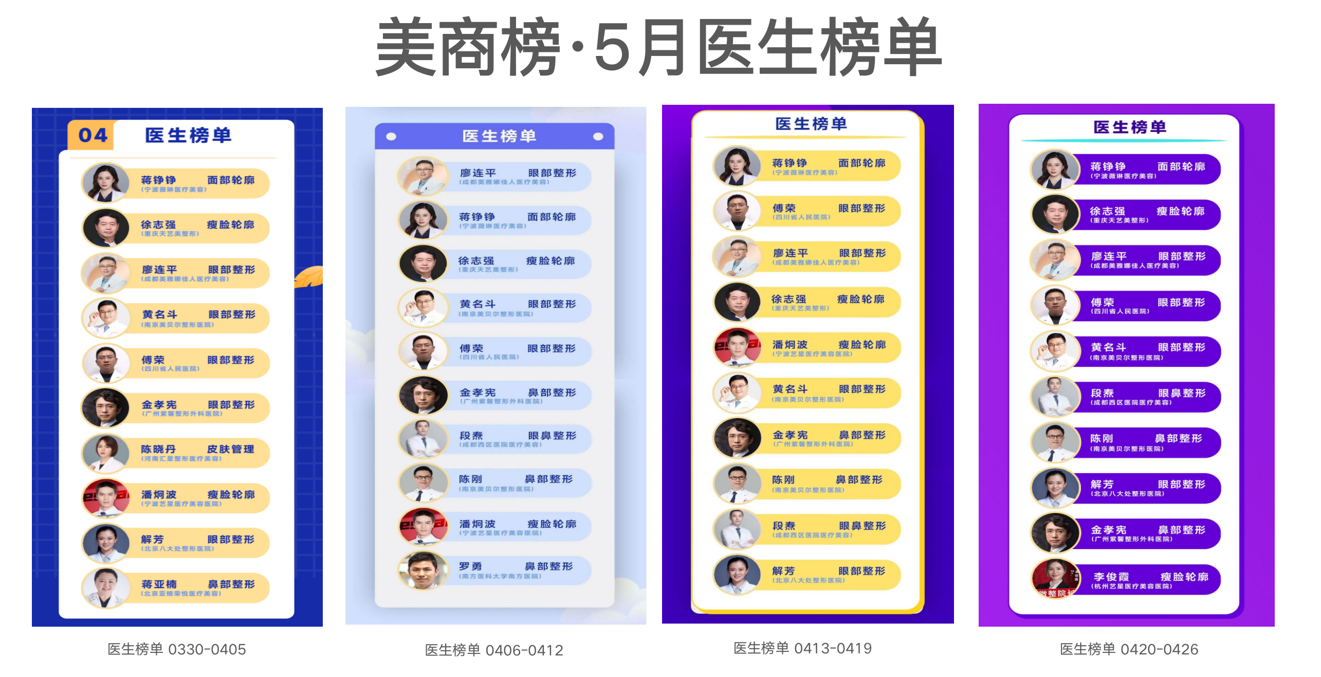 此外,来自四川省人民医院的傅荣医生,南京美贝尔整形医院的黄名斗医生与陈刚医生,成都西区医院医疗美容的段焘医生,广州紫馨整形外科医院的金孝宪医生亦是榜单常客。值得注意的是,杭州艺星医疗美容医院李俊霞本月两度上榜。