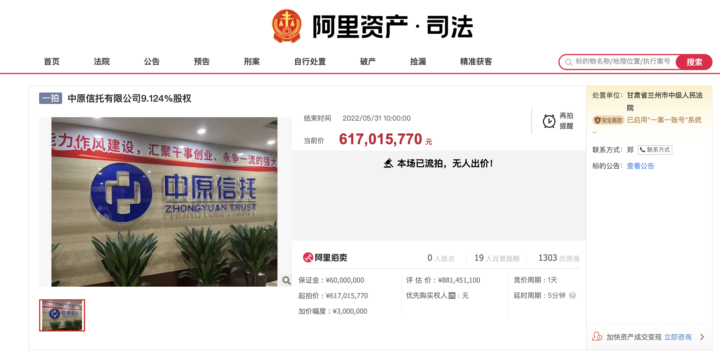 平台数据显示,这笔中原信托的股权评估价为8.81亿元,起拍价为6.17亿元,相当于打了7折,但并没有报名者。
