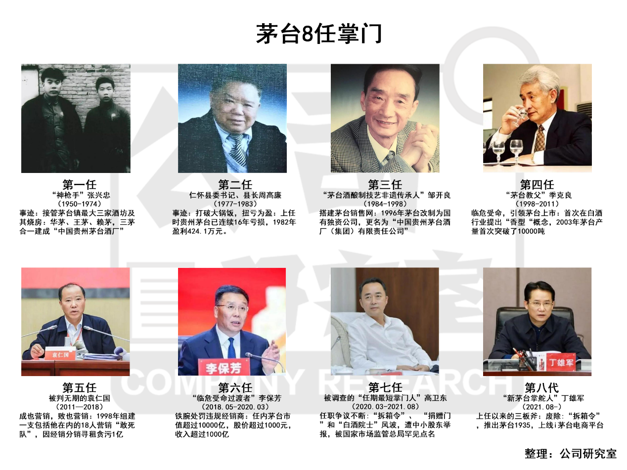 从这8位掌门人的经历来看,前面5任均与茅台酒厂或发源地有密切关系,要么是最初接管的军人,要么是当地父母官,要么是长期在厂子里工作的工人或大学生,算是子弟兵或本地人;后面的3位则均是空降兵,而且上任时好像都是临危受命。