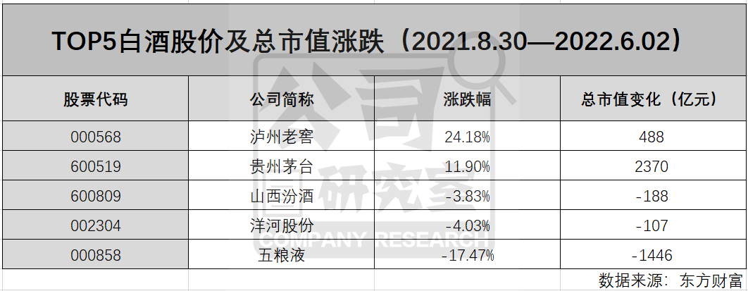 截至2022年6月2日收盘,贵州茅台总市值为2.24万亿,与其上任当日相比,增加了2000多亿,涨幅超过10%。同期,沪深300指数下跌15.04%,A股白酒指数下跌3.37%,在TOP5白酒头部公司中,贵州茅台股价涨幅仅次于泸州老窖。