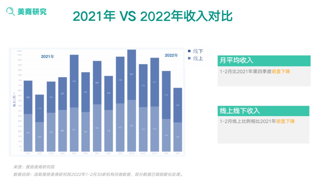 美商研究院调研数据显示,2022年1-2月,30家医美机构月平均客流量下降;对比2021年,30家医美机构1-2月比2021年第四季度月平均收入明显下降,线上比例1-2月比2021年明显下降。