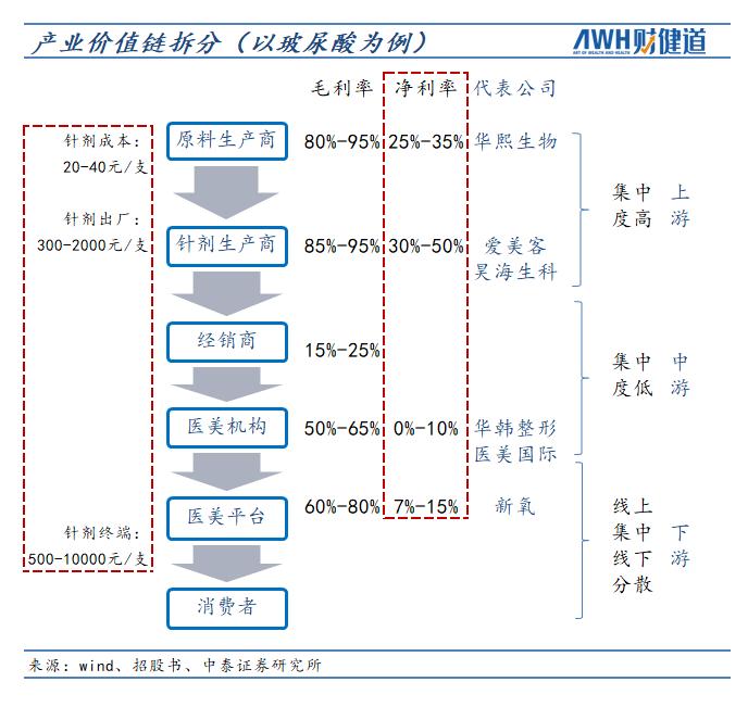 另外,轻医美宣传获客需要经过多重渠道,分红较多,机构最终难以获利。现下,医美行业主要利润集中于上头厂商的格局没有改变,医美机构利润空间本身较小。医美行业上游是医美产品供应商,医美耗材和器械企业毛利率在80%以上,净利率则在40%左右。“玻尿酸三巨头”爱美客、华熙生物、昊海生科,累计市值已达1280亿,玻尿酸业务毛利率超过90%,堪比贵州茅台。医美机构处于行业中游,毛利率在40%-70%之间,净利率仅有10%左右。通常营销渠道的费用占50%以上,销售费用占20%,再加上耗材、运营、人工等支出,医美机构的净利率普遍偏低——一方面由于品牌影响力差,获客成本极高。另一方面由于实力不强,无法形成规模效应。