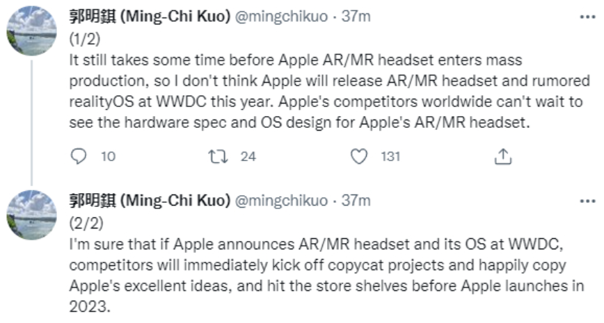 近日苹果分析师郭明祺发文称,苹果大概率不会在今年WWDC上发布MR头显和用于该设备的操作系统realityOS,但他还补充道,如果苹果真的发布了,那么他的竞争对手们将迅速推出类似竞品(启动山寨项目),并先于苹果上市。