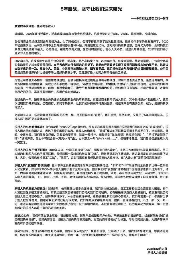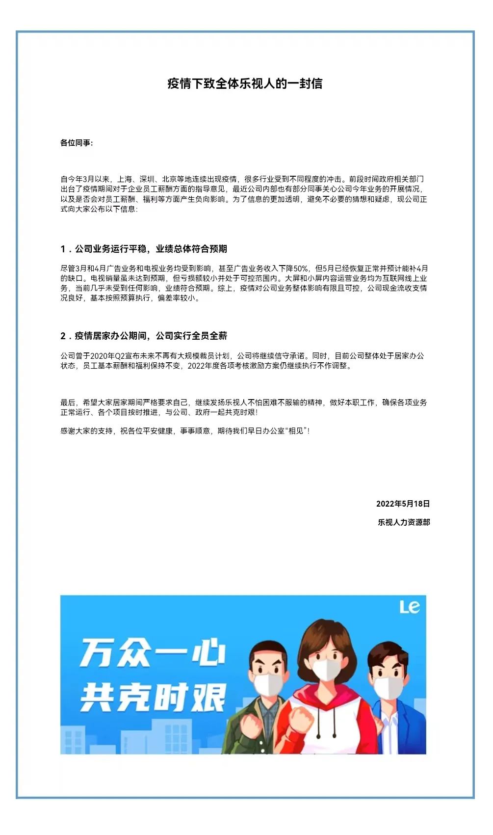 这一轮北京疫情开始时,乐视在内部发了一封全员信,宣布在居家办公期间,对于全员依旧实行全薪,同时宣布不会进行大规模裁员。