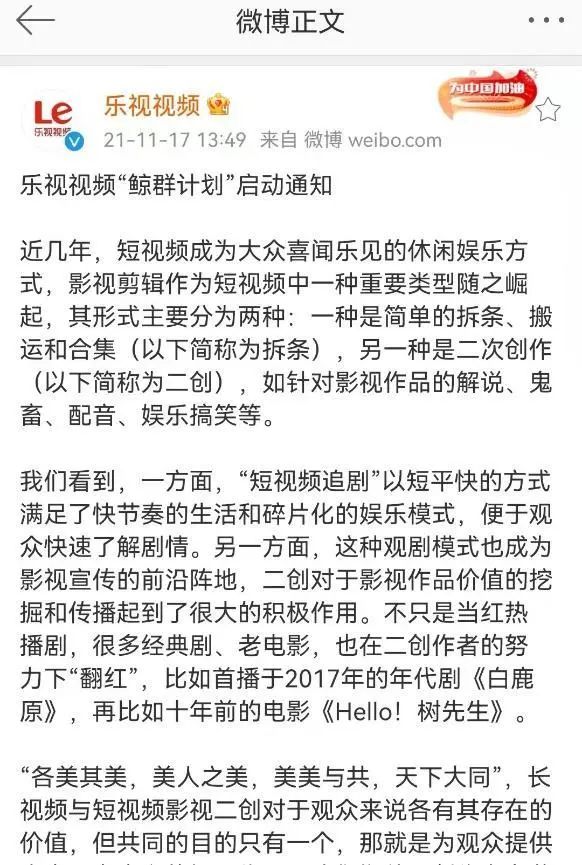 至于乐视网,已经无力再和“爱优腾”们对抗,但依靠过去积攒下来的影视,也并非没有想象空间。去年11月,乐视视频推出了“鲸群计划”,开始与二次创作者合作,通过授权乐视旗下影视剧版权的形式,实现对影视剧作品的二次传播。