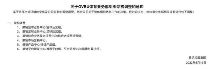 根据媒体报道,腾讯宣布裁撤篮球运营组、足球运营组、综合大项目运营组、市场营销中心、产品中心/增值产品组、平台研发中心/推荐平台组&平台研发中心/画像与算法组共六大业务组。腾讯体育团队原本有大约300人的规模,此次组织机构调整可能将会减员超过三分之一。