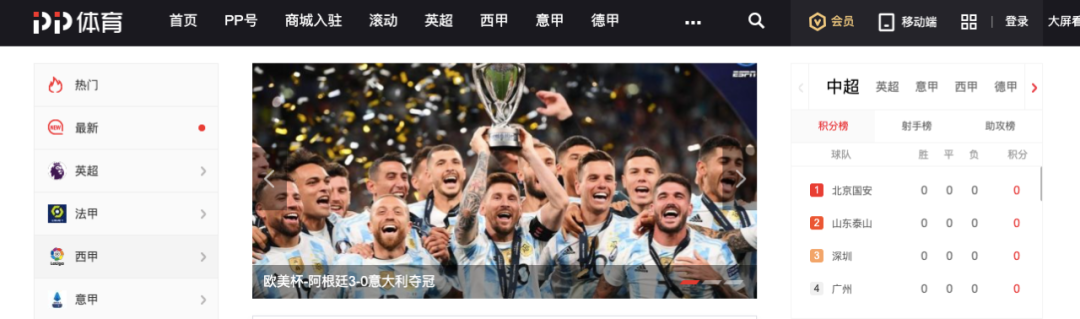 乐视体育之外,苏宁旗下的pptv则聚焦于足球领域,同样也是天价赛事版权的热爱者。据资料显示,从2017年3月至8月,PP体育集齐欧洲五大联赛、中超、亚冠等全球各大职业足球赛事的版权,有消息称,PP体育在成立五年之内,在海外体育版权的购买上花费了超过100多亿人民币。