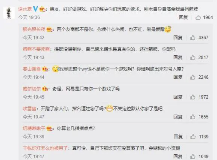 《剑网3》玩家战斗力之强,那可不输饭圈女孩,《逆水寒》玩家直接在官微下留言“你自己扛着吧”。《逆水寒》官微倒真不怵场,#逆水寒叫剑三好好做游戏#立刻安排上,又在晚上十点半发微博@余玉贤,“颠倒黑白前先把自己屁股擦干净吧”。