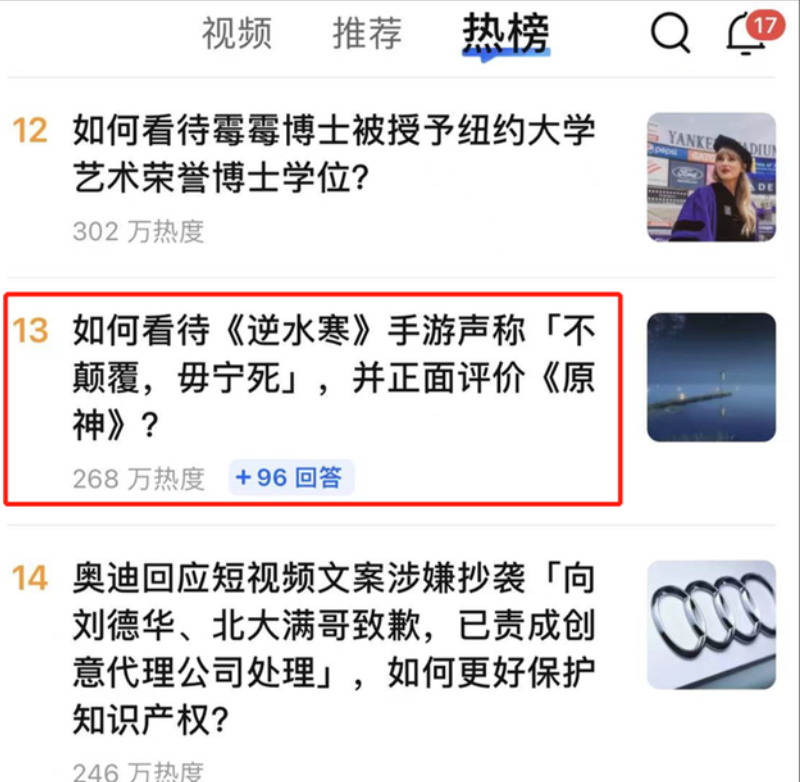 当然,《逆水寒》官微也不是只会撕友商,饭圈那套抱大腿蹭热度的玩法早就精准拿捏。在《逆水寒》手游的简介中,赫然写着“《原神》这样真正开放世界游戏的成功,也让我们明白靠优质内容和持续更新获取更多玩家的喜爱,是成功的唯一路径”。《逆水寒》正面评价原神的相关讨论,则立刻冲上知乎热榜,甚至超过了刘德华奥迪小满文案事件的热度。
