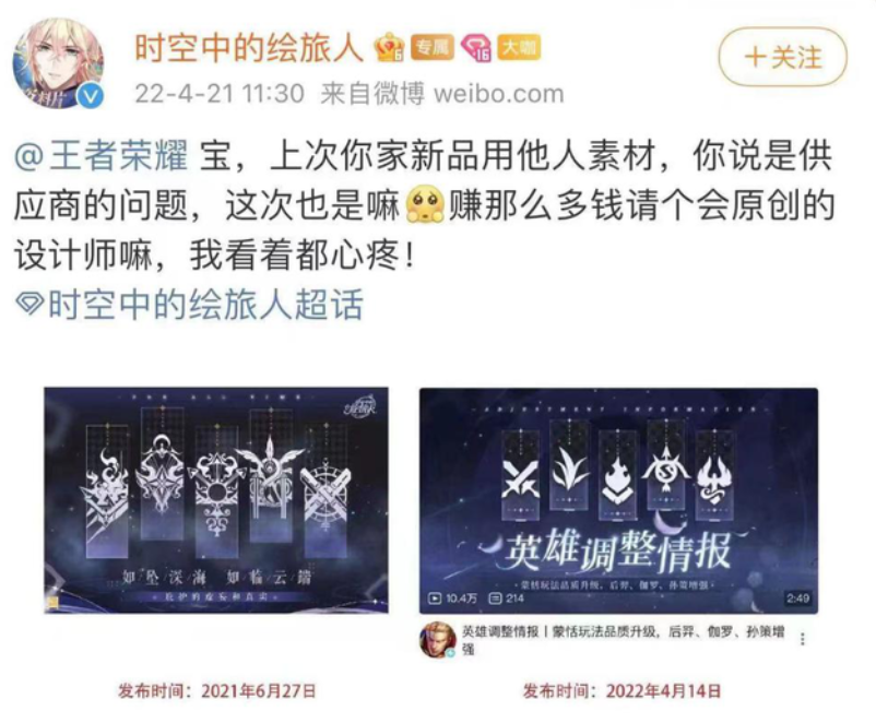 当天,《王者荣耀》供应商发千字长文回应,列出灵感来源、样板设计,并贴出设计过程中沟通的聊天记录,初版及改版设计等。而“很刚”的《绘旅人》,则没再进一步回应。