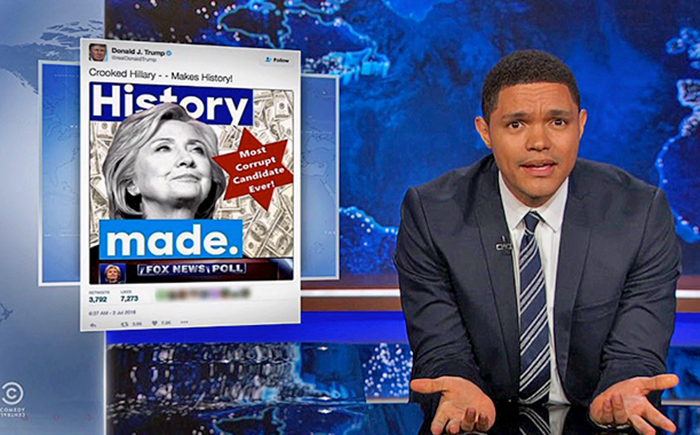 诺亚会在自己的《每日秀》(The Daily Show)上放肆调侃特朗普的竞选,他经常提醒这位总统候选人对自己在社交媒体上可能引发争议的行为多抱希望。“你看,特朗普,转发一个东西一次,你说这是加入了我观点的混合物。转发一个东西两次,你就说你不太会用推特了。不过正如有人指出的那样,你不过是个种族主义者罢了。”他对特朗普七月份转发了种族主义推文一事评论道,“你可能是在像吹狗哨一样把你的人聚拢在你身边,但你应该知道我们所有人都看得见你发了些什么鬼。当然发召集令是可以的,但种族主义无论何时都是狗屎一堆。”