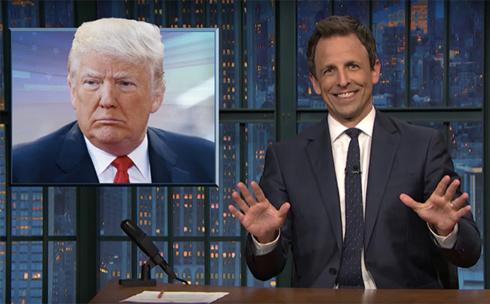 迈尔斯在《午夜》(Late Night)栏目中封杀了特朗普,接着在自己的脱口秀上嘲笑他。六月的时候他开玩笑地说,“唐纳德,今天是个好日子啊。如果从现在起到7月18日共和党大会开幕之间的任何时候,你退出了总统选举,NBC承诺奖励你一个13集的剧集,让你痛痛快快地演一把美国总统。我想澄清的是,我做这件事并没有受任何人指使,但既然他们每晚都看我们的节目,所以我想象不出NBC高层会有什么理由拒绝你。他们又不挑剔……你想做的很多事在现实里根本不可能,但是在电视上,我们只需要盖一小段墙,其他的就用电脑做出特效就好了。”