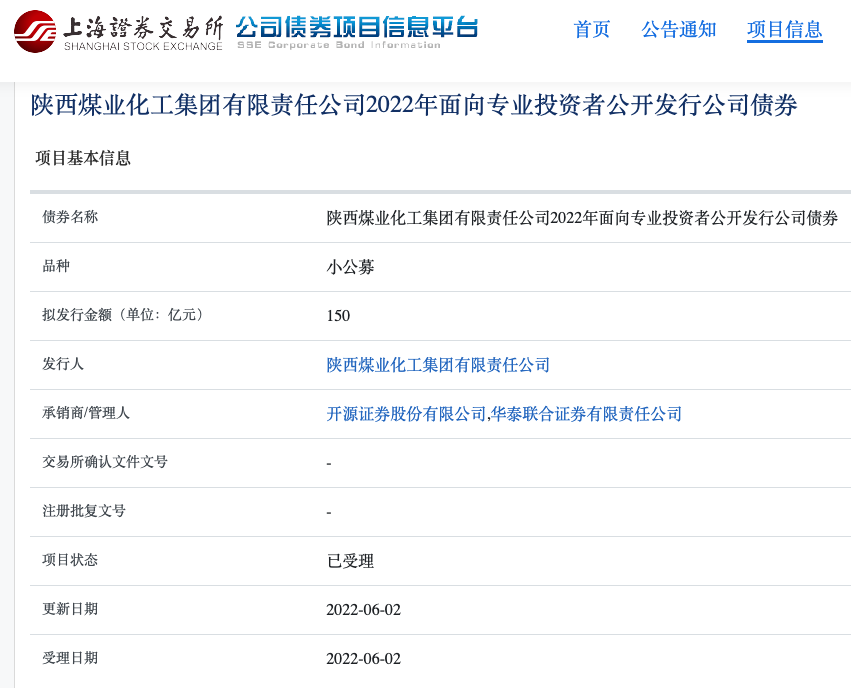 上交所公司债券项目信息平台显示,陕西煤业化工集团有限责任公司150亿元小公募项目状态更新为“已受理”,更新日期为2022年6月2日,受理日期为2022年6月2日。根据募集说明书申报稿,本次债券发行总额不超过150亿元,采取分期发行,募集资金扣除发行费用后,拟用于偿还到期债务本息。