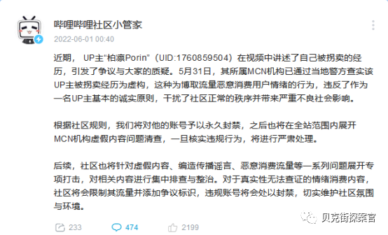 根据哔哩哔哩社区小管家2022年6月1日发布的动态,B站虚拟主播“柏凛Porin”日前发布的《关于我消失了半年其实是被拐卖了这件事》视频内容不属实,已被永久封号。