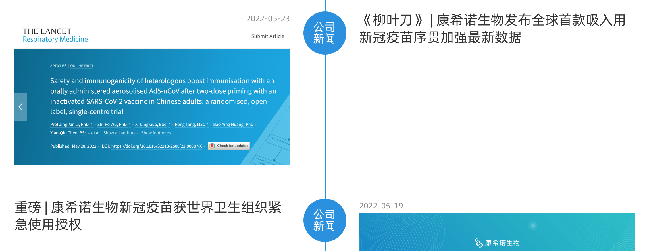 5月23日,康希诺官方网站显示,公司发布全球首款吸入用新冠疫苗序贯加强最新数据,研究表明,康希诺吸入用腺病毒载体新冠疫苗克威莎(下称吸入用克威莎)仅需肌注剂型的1/5或2/5即可产生高于肌肉注射的中和抗体水平,不仅可激发体液及细胞免疫,还可高效诱导黏膜免疫,以达到三重全面保护,同时具有安全有效、无痛便捷、可及性更高等独特优势,或为高效序贯加强的优先选择。