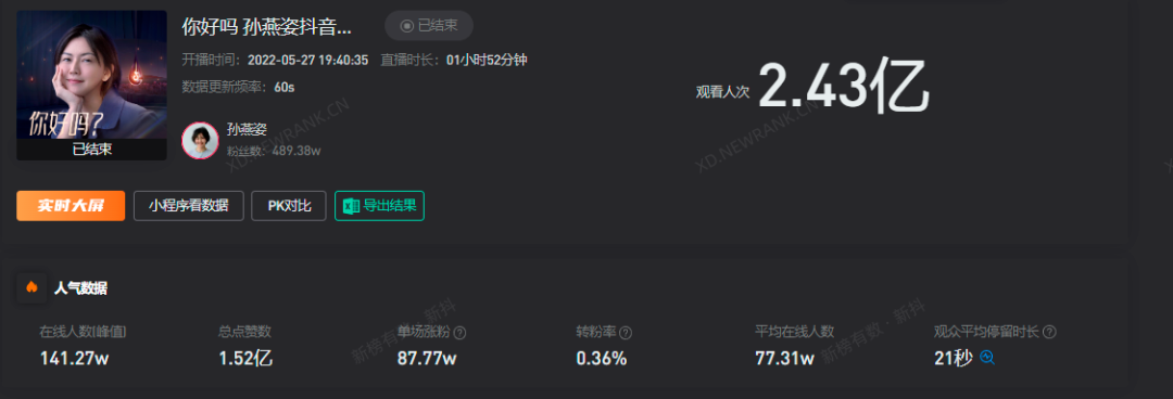 最终,孙燕姿的直播巅峰时期观看人数高达141.27万,累积观看人次达到了2.43亿次,单场直播涨粉87.77万。
