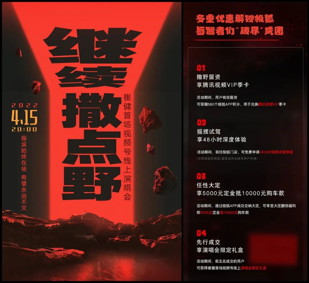 瞄准线上直播的用户规模,商业赞助强势入局。在崔健演唱会后,极狐汽车还对外透露了转化率:高意向留资信息破千,转化率达到50%以上。而极狐汽车也赞助了罗大佑的视频号演唱会,打出了一套营销的组合拳,5月27日演唱会当天,“极狐”微信指数接近500万,热度持续数天。据了解,极狐还在谋求与视频号演唱会的第三次合作。