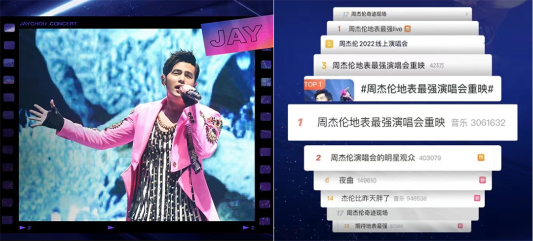 5月20日、21日两晚,“地表最强魔天伦”周杰伦两场演唱会重映上线直播。虽被调侃为“大型DVD放映现场”,但仍有近亿人次观看,为微博贡献了近50亿次的相关话题阅读量。