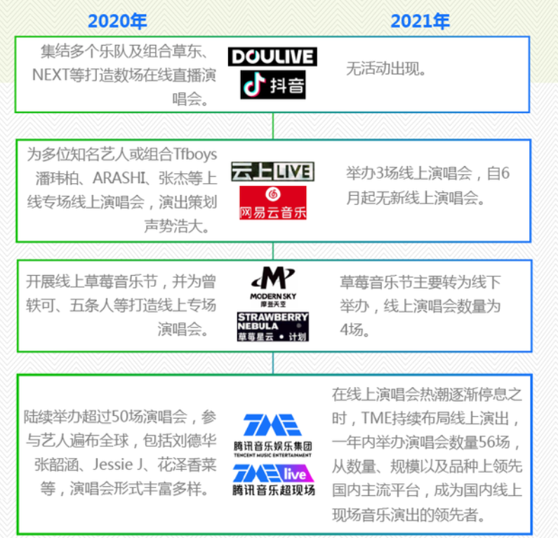 另一方面,就目前形势来看,各家平台未来的战略布局并不明朗。是先通过头部艺人培养用户消费习惯,再带动非头部艺人的线上演出,还是加强头部音乐人资源在不同平台间的流转,还未可知。