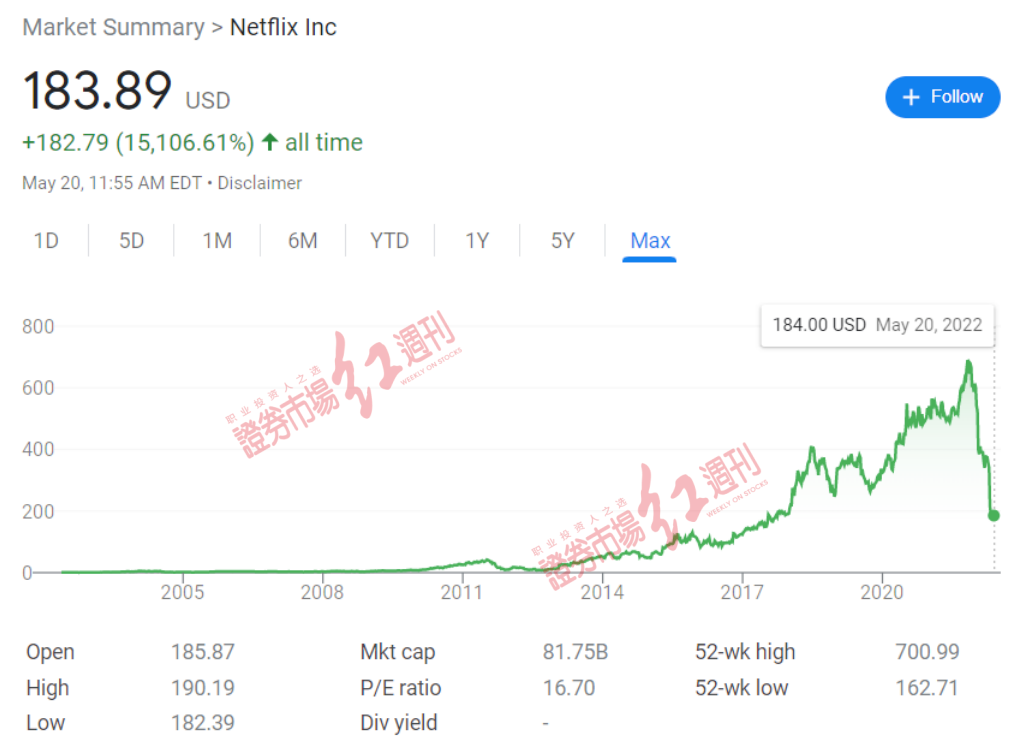 但在最新披露的一季报以及业绩说明会透露的信息显示,迪士尼每个季度的订阅人数仍在以几百万的幅度增长,奈飞却指引二季度订阅人数将下降。因此,过去6个月,奈飞的股价从700美元/股下挫到170美元/股,股价甚至回到了5年前的位置。