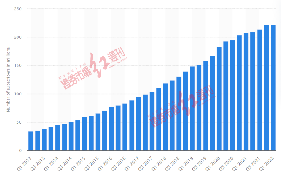 从图2可以看到,奈飞流媒体频道的全球订阅人数从2013年一季度的3800万,增加到2022年一季度的2.2亿。
