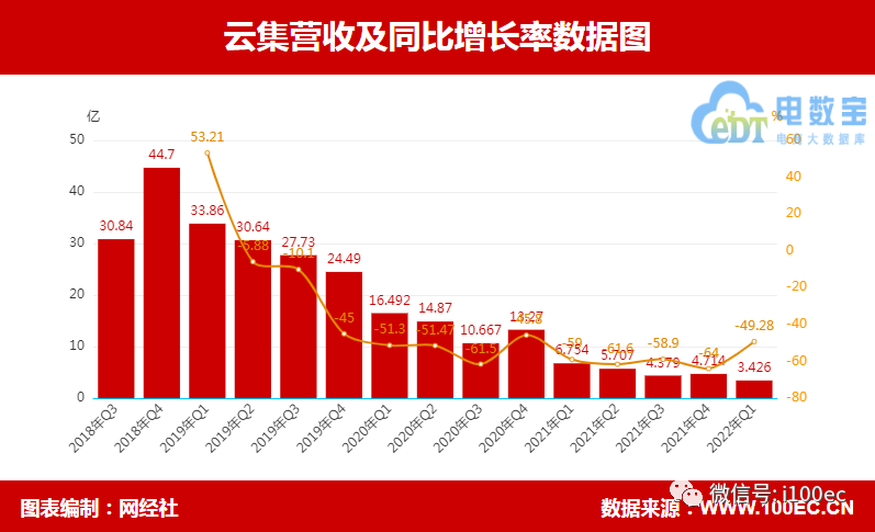 2022年第一季度,云集总营收为3.426亿元人民币,同比下降了49.28%。对此,财报解释称,主要是受2022年初新冠病毒对公司运营的负面影响,以及公司不断完善所有类别的产品,选择并优化供应商和商户的战略调整,导致近期销售额下降。