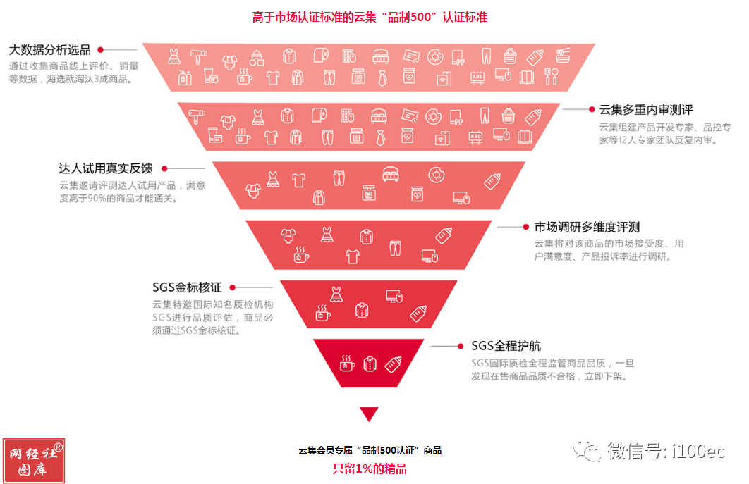 面对这些境况,云集聚焦于极致精选战略,通过“社会化选品”机制对自有品牌矩阵进行扩容的同时,推出“云集精选”品质认证。“云集精选”主要面向“社会化选品”漏斗所精选的上架商品,每周从畅销指数、美食达人推荐指数、复购指数、品质稳定指数、评价指数五大维度进行全方位、全面的评选。