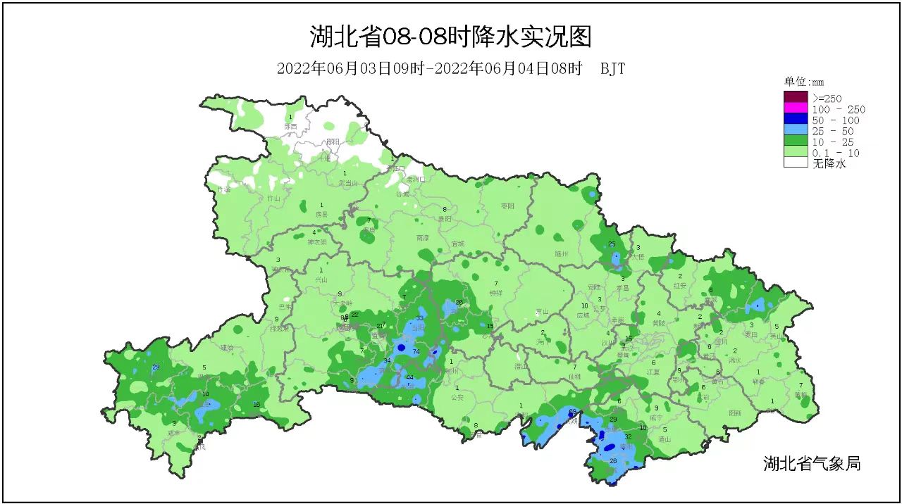 据湖北省气象局统计,昨天(6月3日)雨水分布在湖北南部地区,咸宁、荆州、宜昌、恩施等地局地出现大雨或暴雨,枝江24小时最大降雨量127.3毫米,达大暴雨量级。